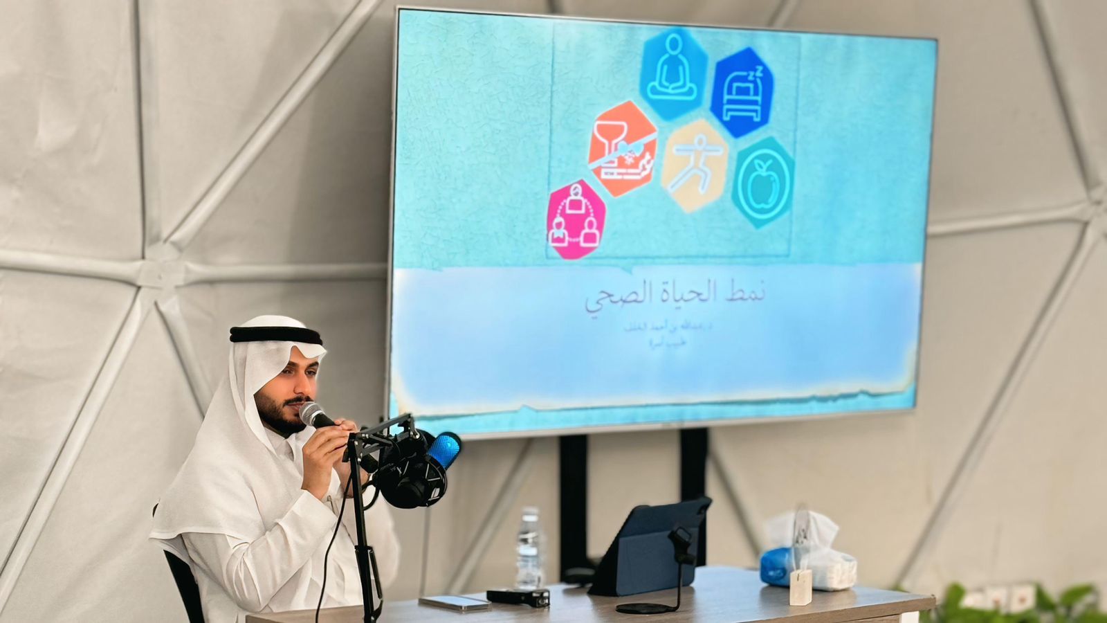 وقد تحدث في بداية الأمسية عن نمط الحياة وماذا يقصد به كما ذكر أن طب نمط الحياة هو تخصص طبي يستخدم التدخلات العلاجية المرتبطة بأسلوب الحياة كوسيلة رئيسية لعلاج الأمراض المزمنة بما في ذلك، على سبيل المثال لا الحصر، أمراض القلب والأوعية الدموية، وداء السكري من النوع الثاني، والسمنة من خلال تطبيق تغييرات شاملة في نمط الحياة قائمة على الأدلة العلمية المثبتة لعلاج هذه الحالات، وغالبا ما يمكن التشافي منها عند استخدامها بشكل سليم.