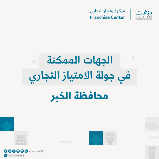 تنظم الهيئة العامة للمنشآت الصغيرة والمتوسطة “منشآت” أولى جولات الامتياز التجاري في محافظة الخبر خلال الفترة من 12 وحتى 13 أغسطس، بشراكة مع وزارة التجارة وبرنامج التحول الوطني وبنك التنمية الاجتماعية وبنك المنشآت الصغيرة والمتوسطة، إلى جانب مشاركة عددٍ من الجهات الداعمة والممكنة؛ بهدف التعريف بالخدمات والبرامج في مجال الامتياز التجاري، بما يحقق مستهدفات رؤية المملكة 2030، وذلك في مركز دعم المنشآت بالمحافظة.
