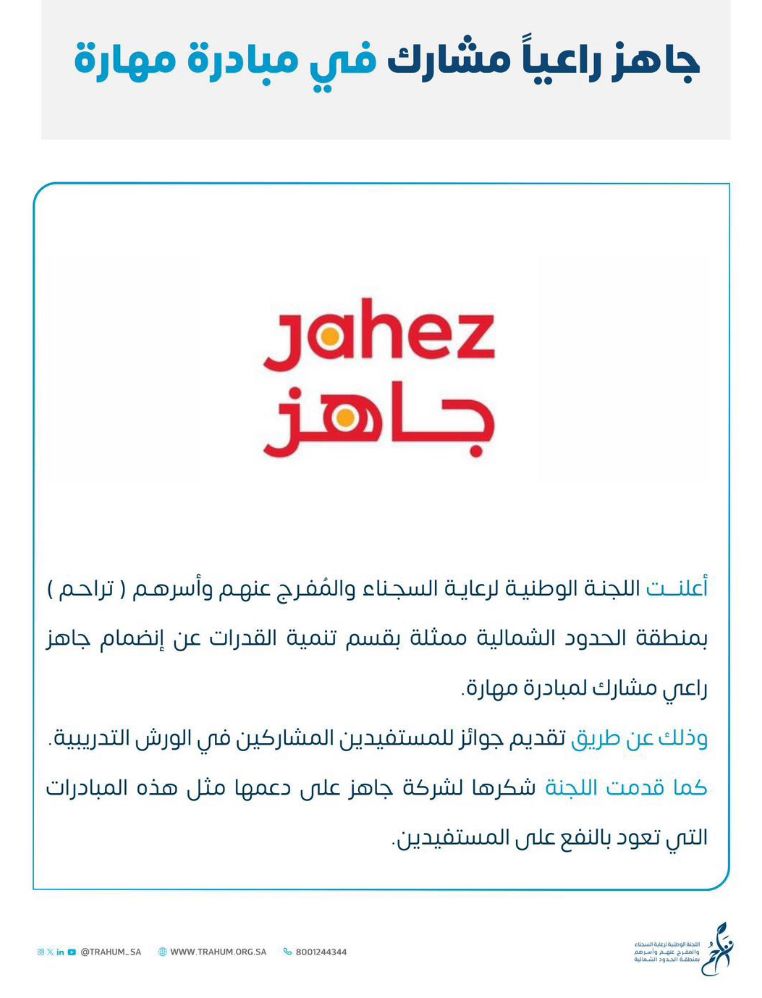 اعلنت اللجنة الوطنية لرعاية السجناء والمفرج عنهم وأسرهم (تراحم) بمنطقة الحدود الشمالية بقسم تنمية القدرات عن انضمام جاهز راعي مشارك لمبادرة مهارة.