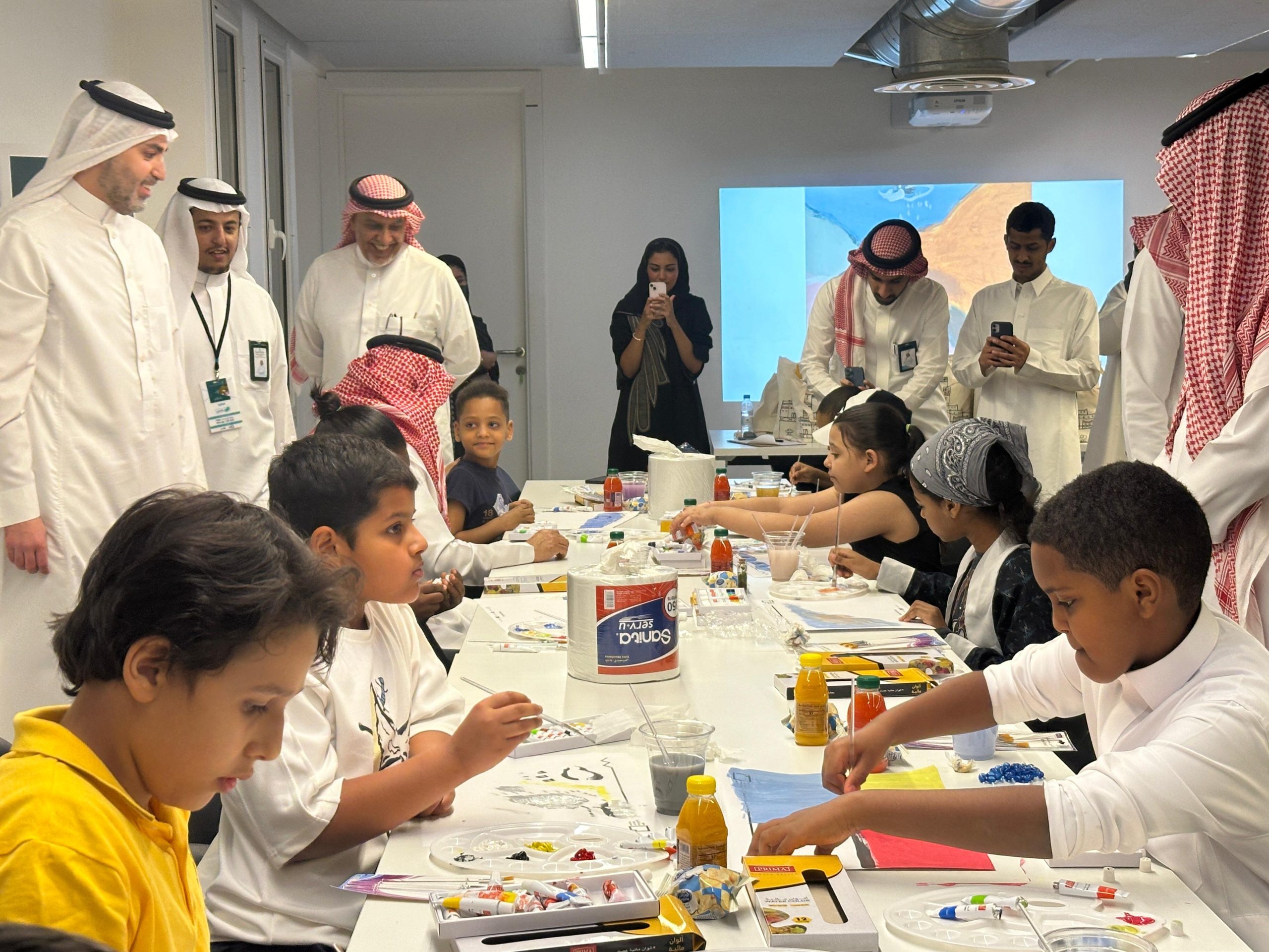 حيث تجول الجميع في متحف الأمير فيصل بن فهد للفنون التشكيلية، واطلعوا على اللوحات المعروضة واستمعوا إلى شرح عنها، كما أقيمت لهم ورشة عمل للفن التشكيلي وتم تشجيعهم أثناء الرسم فعبروا من خلالها عن هواياتهم الفنية في الرسم وأبدعوا برسومات جميلة ومعبرة نالت إعجاب الجميع، وتم أخذ الصور التذكارية وتوزيع الهدايا عليهم.