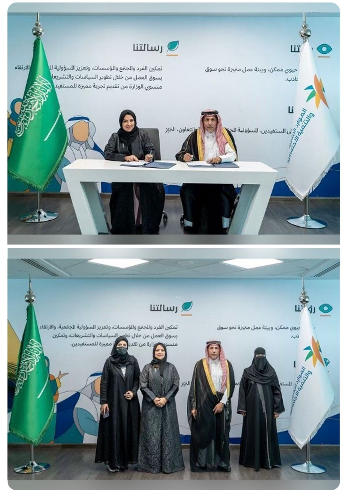 حيث مثل وزارة الموارد البشرية والتنمية الاجتماعية في التوقيع سعادة الوكيل المساعد للتوجيه الاجتماعي المهندس أحمد بن محمد الحديثي، فيما مثل جمعية طفولة آمنة سعادة رئيس مجلس الإدارة الأستاذة نسرين بنت محمود أبو طه، .