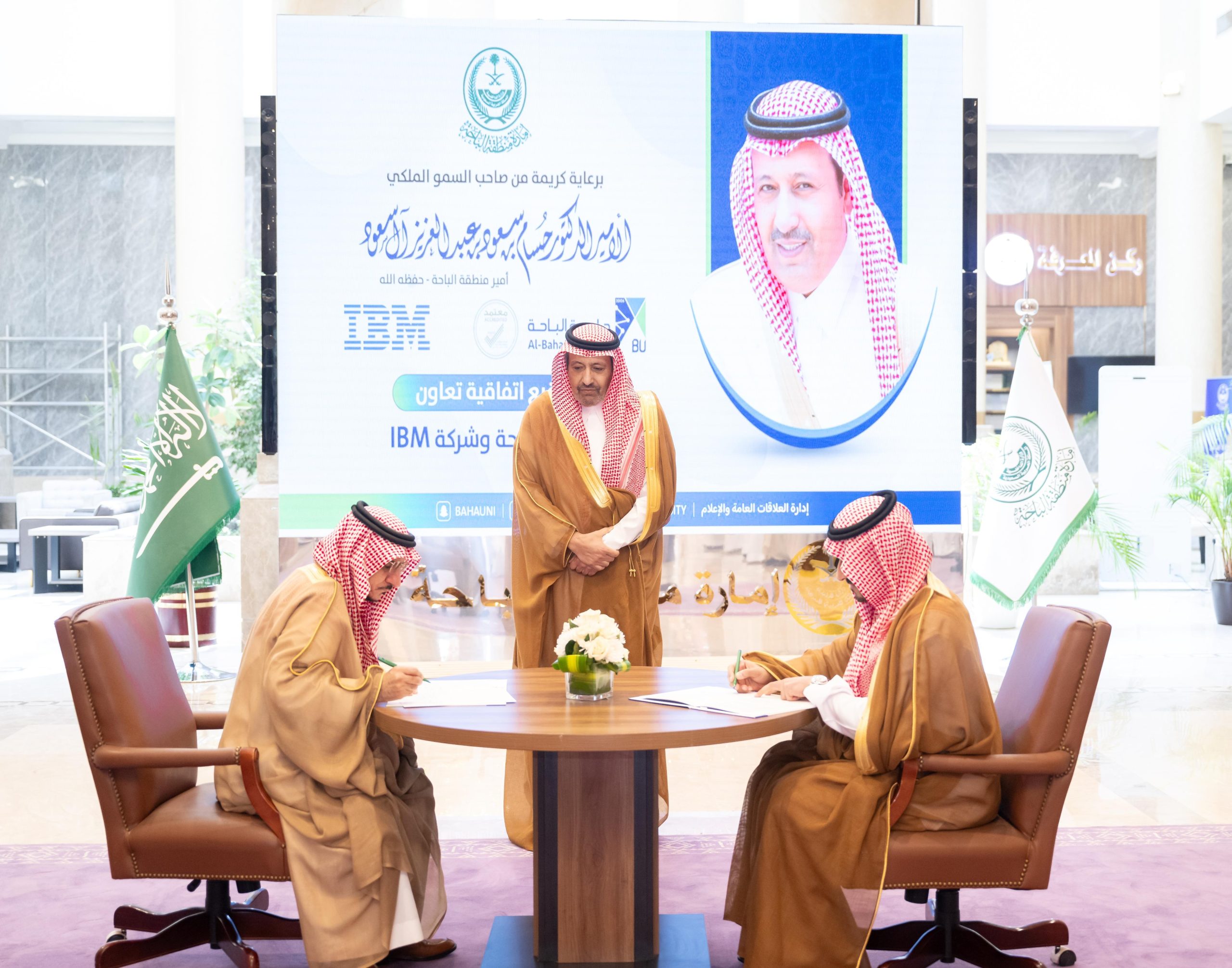 شهد صاحب السمو الملكي الأمير الدكتور حسام بن سعود بن عبد العزيز أمير منطقة الباحة، توقيع مذكرة تفاهم بين جامعة الباحة وشركة IBM، بحضور معالي رئيس الجامعة الاستاذ الدكتور عبدالله بن يحيى الحسين، والشريك الإداري لشركة للاستشارات في الشرق الأوسط وأفريقيا بيل فاريل، والشريك الإداري ومدير عام الشركة للاستشارات في السعودية خالد العفيصان، إلى جانب ممثلين عن جامعة الباحة والشركة، و ذلك في ديوان الإمارة اليوم .