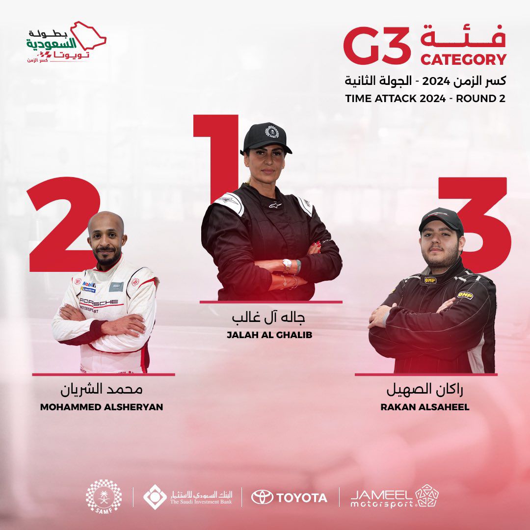 ضمن بطولة السعودية تويوتا وفي بطولة كسر الزمن الجولة الثانية والمقامة في مدينة الرياض على حلبة ديراب يوم امس الأول ،حصلت المتسابقة جالا آل غالب على المركز الأول في فئة G3 والمركز الأول أيضا على كأس السيدات وفي الترتيب العام أحتلت المركز ١٣ من أصل ٧٢ متسابق ومتسابقة بزمن قدره ١.٢٧.٠٠٤