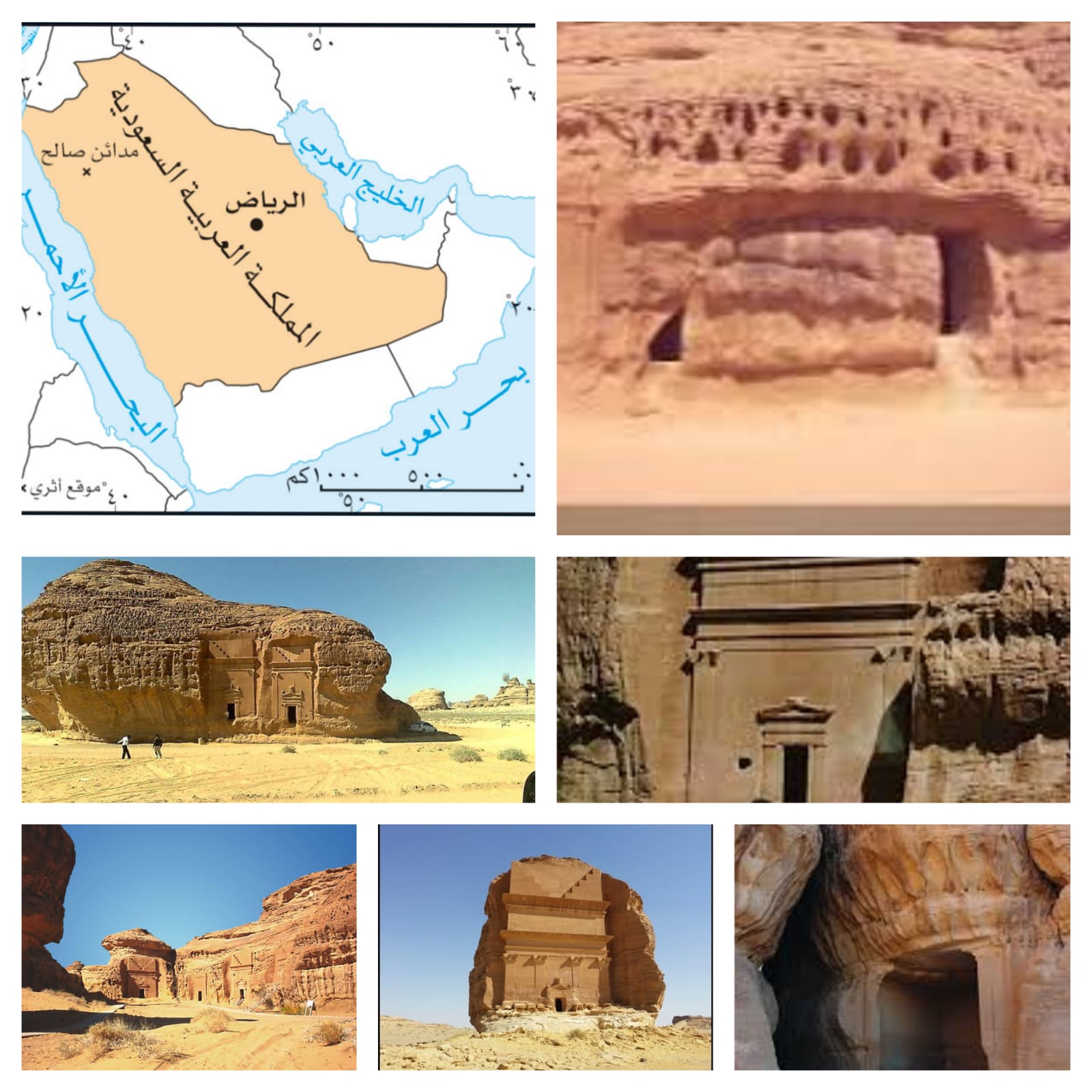 وتشير الكتابات التي وجدت في مدائن صالح إلى المدينة ربما كان قد أنشأها المعينيون، كما تشير مقابرها التي جمعت في نحتها عناصر فنية مختلفة -فرعونية وإغريقية ورومانية وعربية- إلى أنها تشبه إلى حد كبير ما هو موجود في البتراء، ولعل هذا سببه أنهما ذات حضارة واحدة، وإن كانت مقابر مدائن صالح إنما تتميز بوجود شواهد عليها، مكتوبة بالخط الآرامي النبطي