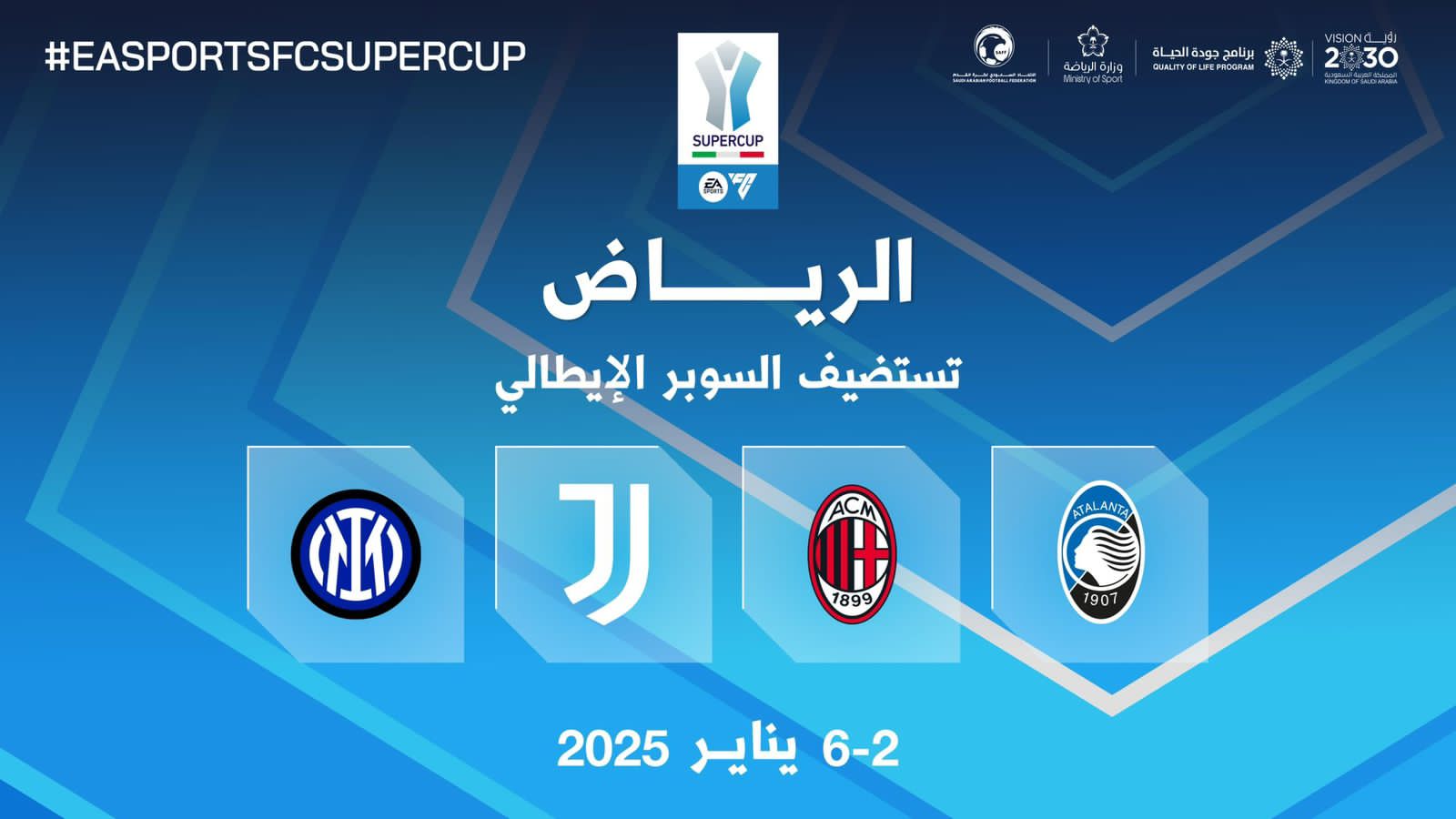 أعلنت وزارة الرياضة، اليوم الثلاثاء الموافق 8 أكتوبر 2024م، استضافة المملكة لمنافسات كأس السوبر الإيطالي للمرة الخامسة في العاصمة الرياض؛ خلال الفترة من 2 إلى 6 يناير 2025م، وبمشاركة أربعة أندية، هي: إنتر ميلان “بطل الدوري الإيطالي”، وإيه سي ميلان “وصيف النسخة الماضية من الدوري”، وفريق يوفنتوس “بطل كأس إيطاليا”، وأتالانتا “وصيف بطل الكأس”.