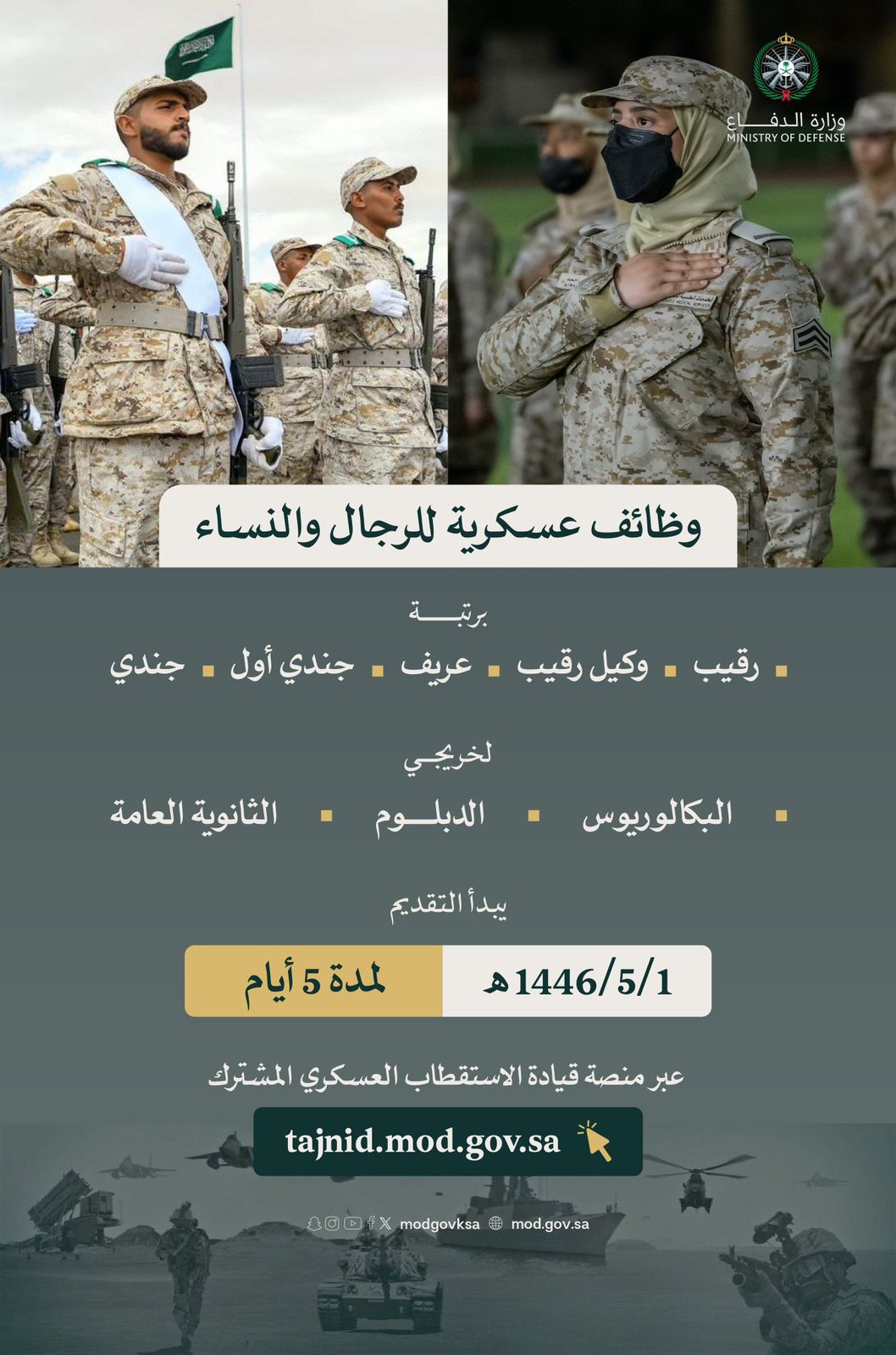 أعلنت وزارة الدفاع عن فتح باب القبول والتسجيل للوظائف العسكرية “رجال – نساء” من رتبة “رقيب حتى جندي” في مختلف التخصصات لحملة البكالوريوس والدبلوم والثانوية العامة وما يعادلها، والتقديم عبر منصة قيادة الاستقطاب العسكري المشترك.