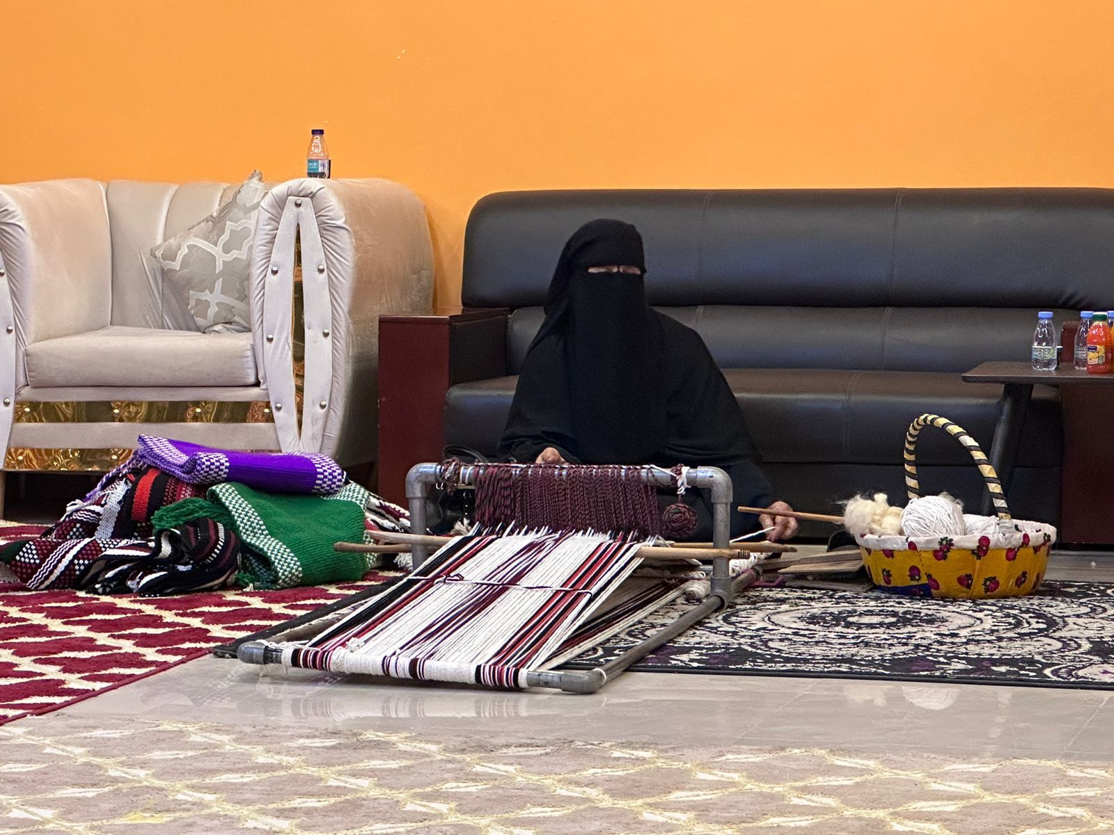بعد ذلك تطرقت لحرفة السدو والنسيج من بداية جز الصوف وغسيله ثم تجفيفه ، وبعد ذلك غزله بالمغزل وتحويله لخيوط جاهزه لعملية النسيج وصناعة بيوت الشعر .