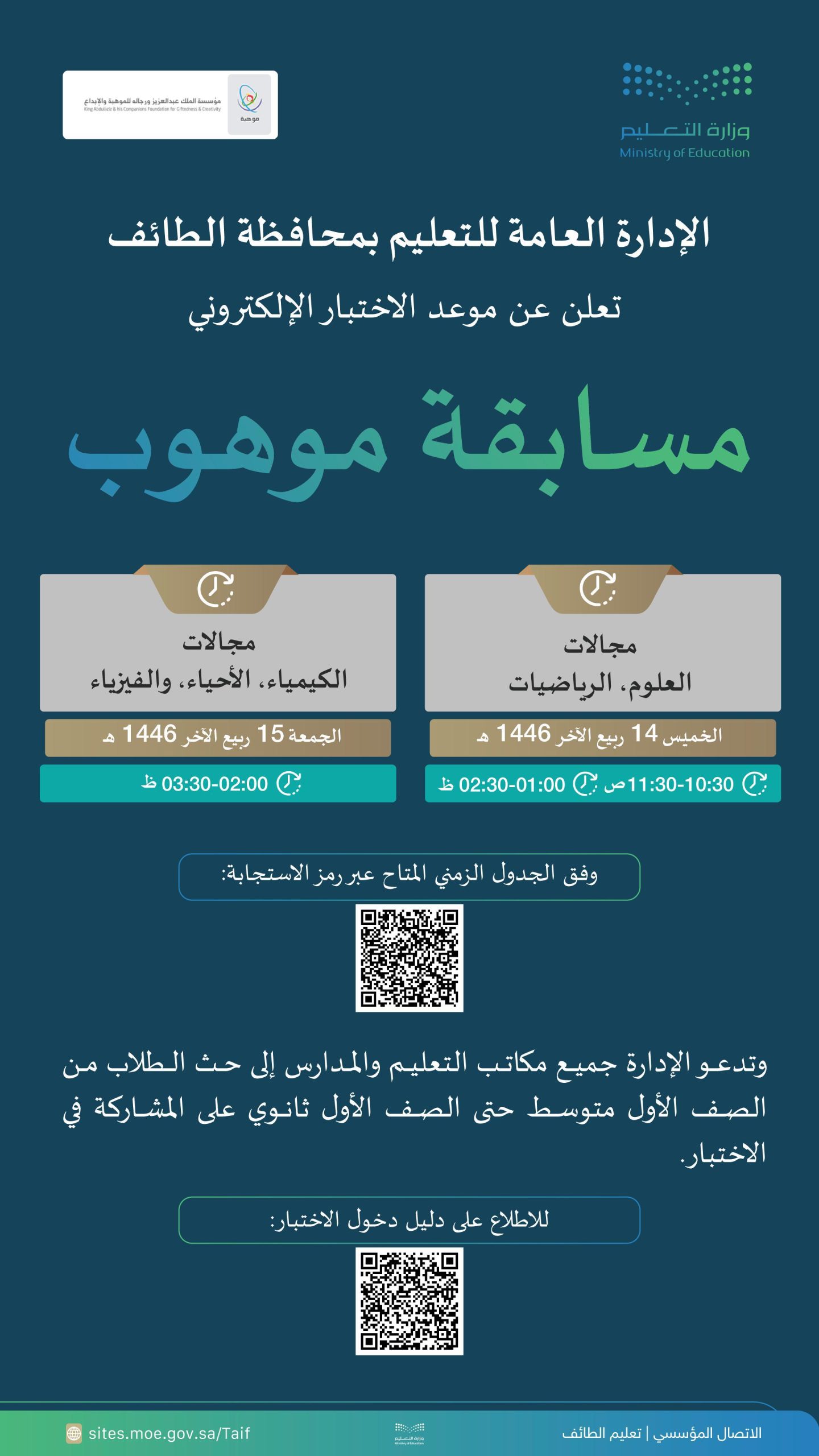 أعلنت الإدارة العامة للتعليم بمحافظة الطائف عن موعد الاختبار الإلكتروني لمسابقة موهوب والذي تشرف عليه مؤسسة الملك عبد العزيز ورجال للموهبة والإبداع ، حيث يبدأ يوم غدٍ ‏ الخميس في مجال العلوم والرياضيات وبعد غدٍ الجمعة في مجال الكيمياء والأحياء والفيزياء . ‏وتدعو الإدارة العامة للتعليم بمحافظة الطائف جميع مكاتب التعليم والمدارس بحث الطلبة للدخول إلى الاختبار حسب الصفوف المستهدفه من الصف الأول متوسط إلى الصف الأول ثانوي . ‏ويأتي إقامة هذه المسابقة العلمية سنويا ، حيث تستهدف الطلبة من الصف الأول متوسط إلى الصف الأول ثانوي كما تهدف إلى اكتشاف الطلبة المتميزين في العلوم والرياضيات والفيزياء والكيمياء والأحياء بهدف إلحاقهم بالبرامج التدريبية المتخصصة للتدريب وتأهيلهم للمشاركة في المسابقات والأولمبياد الدولي وأيضا إلى تطوير العملية التعليمية .