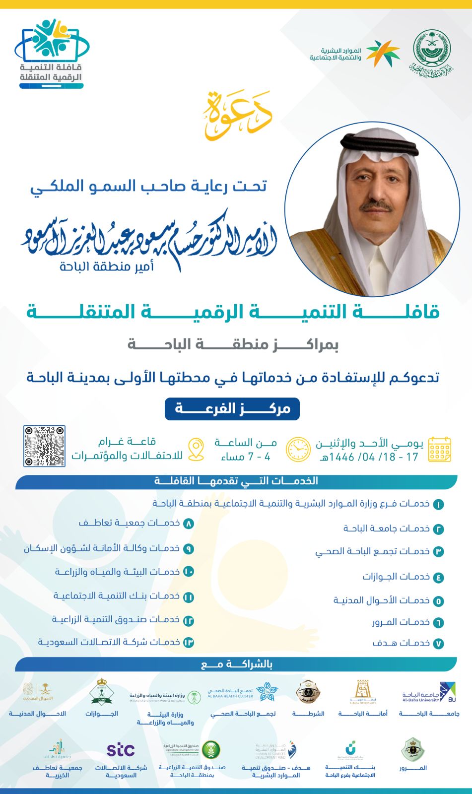 برعاية صاحب السمو الملكي الأمير الدكتور حسام بن سعود بن عبدالعزيز أمير منطقة الباحة, تنطلق غدًا قافلة التنمية الرقمية المتنقلة في 42 مركزًا في المنطقة ومحافظاتها.